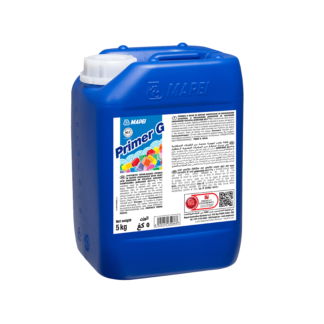 Applications: Treating gypsum or anhydrite surfaces prior to installing ceramic tiles and stone material with cementitious adhesives or levelling. The surfaces to be treated must be clean and porous. Dilute Primer G with water from 1:1 to 1:3 to protect old floors before levelling, to fix the residual dusting and to provide even absorption of substrates prior to levelling or laying. Apply on perfectly dry gypsum or anhydrite surfaces (residual moisture content less than 0.5%).